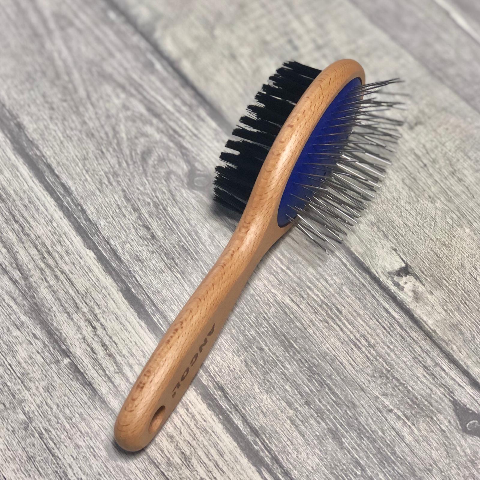 Then Ancol Ergo Wood Handle Double Sided Brush is a multi-purpose tool to simplify grooming. The pin side of the brush features stainless steel pins with rounded edges, to tease out tangles and removes loose hairs while being gentle on your pet's skin. The bristle side can then be used to smooth the coat.