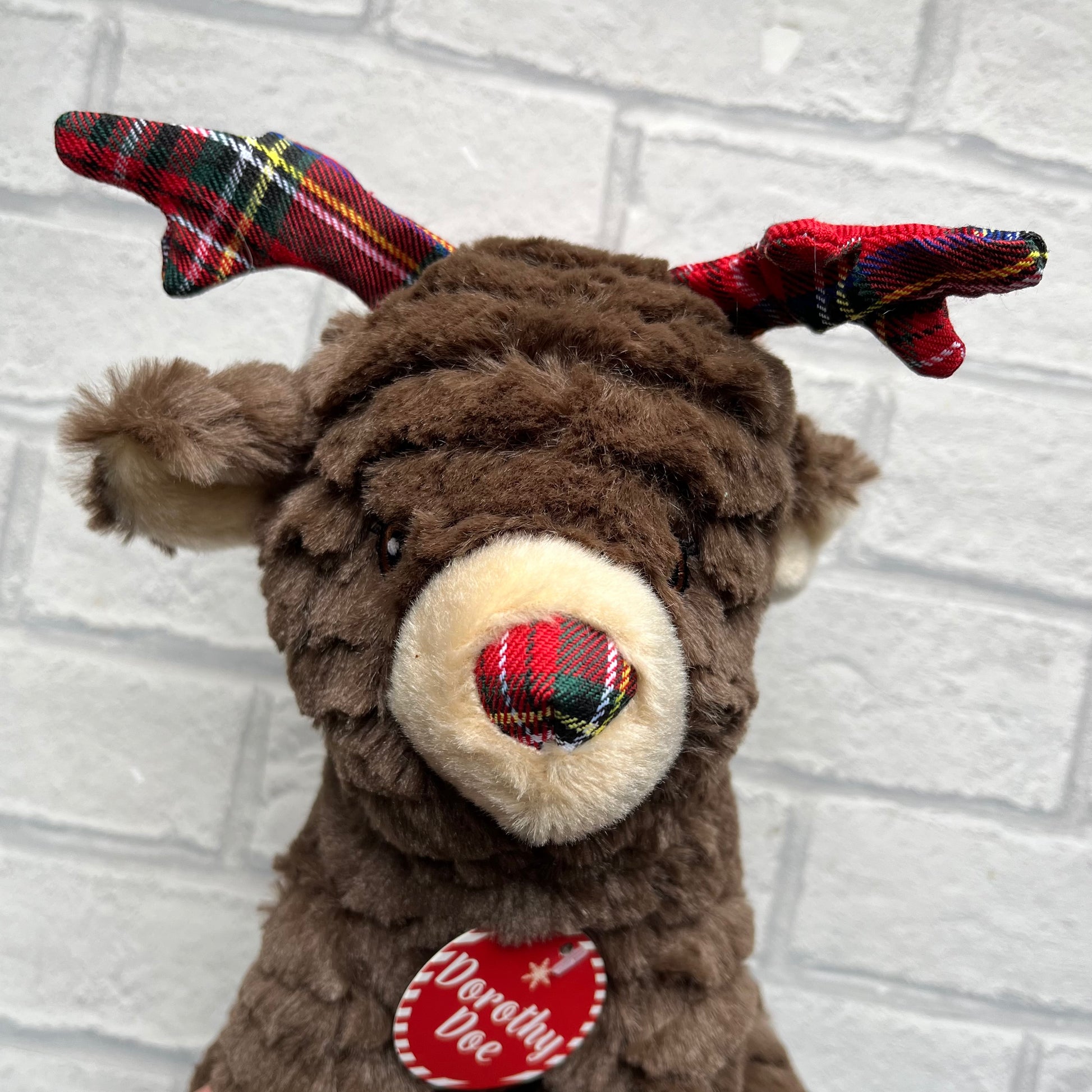 Dorothy Doe is a gorgeous soft toy with tartan trim crinkly antlers and feet which dogs will love to cuddle and play with. The squeaker adds to the fun!