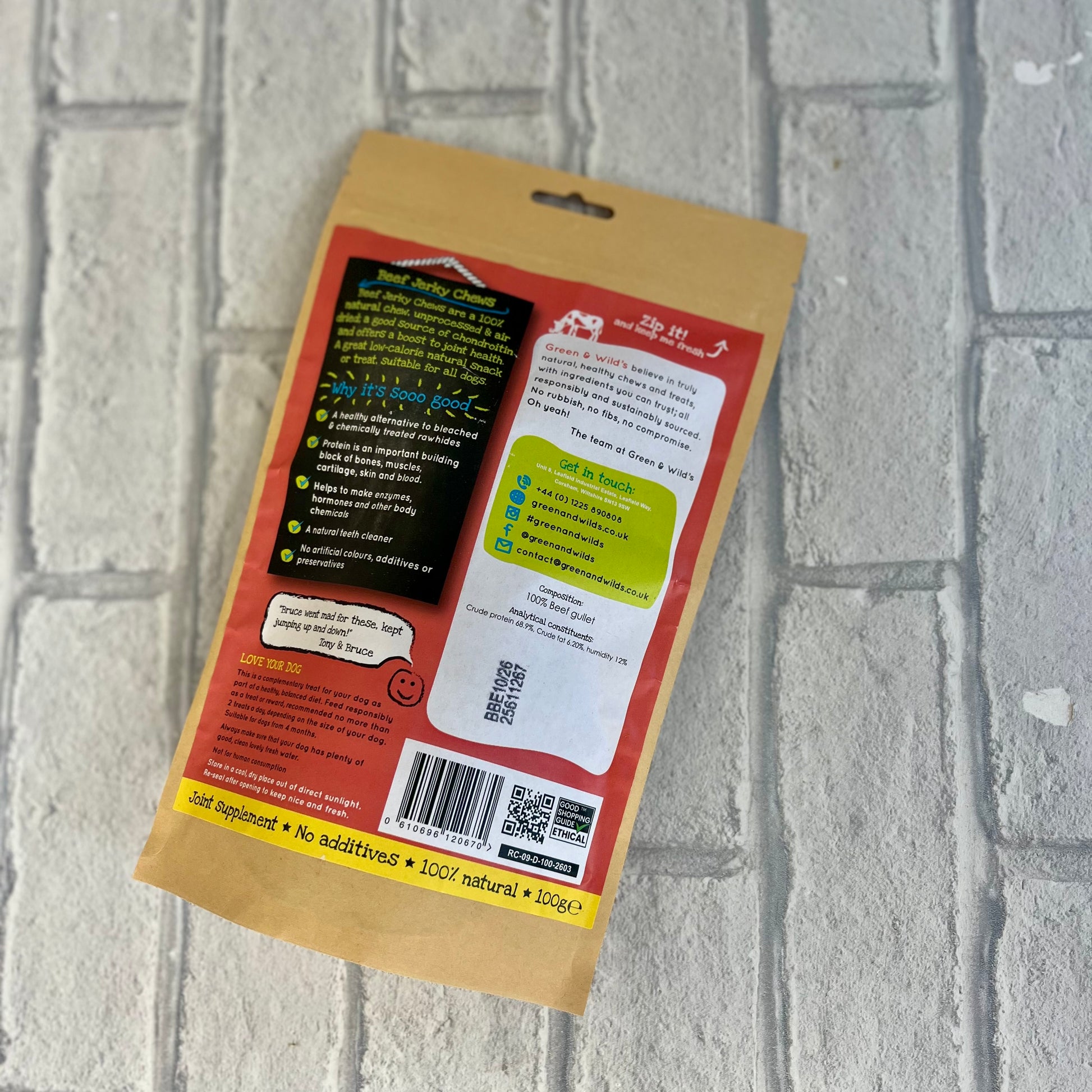 Beef jerky chews are a 100% natural chew, with a good source of chondroitin and offer a boost to joint health. A great low-calorie natural snack or treat, suitable for all dogs. A healthy alternative to bleached and chemically treated rawhides.