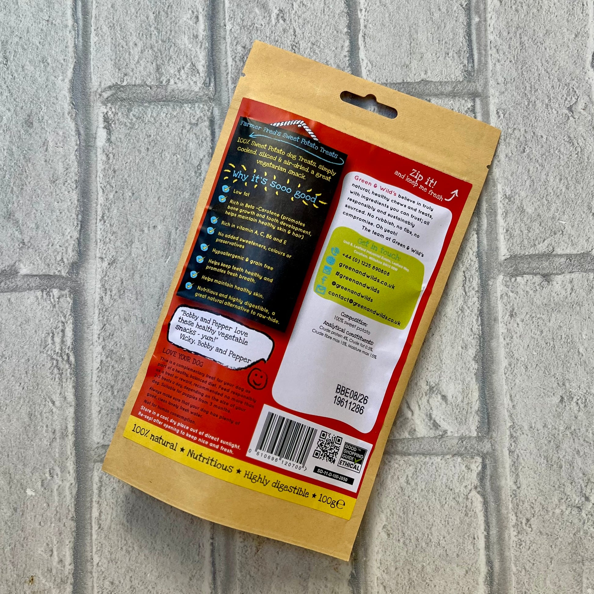 The texture of our Sweet potato treats acts as a natural toothbrush, helps keep teeth healthy and promotes fresh breath. It is 100% natural, containing no animal by-products or preservatives.