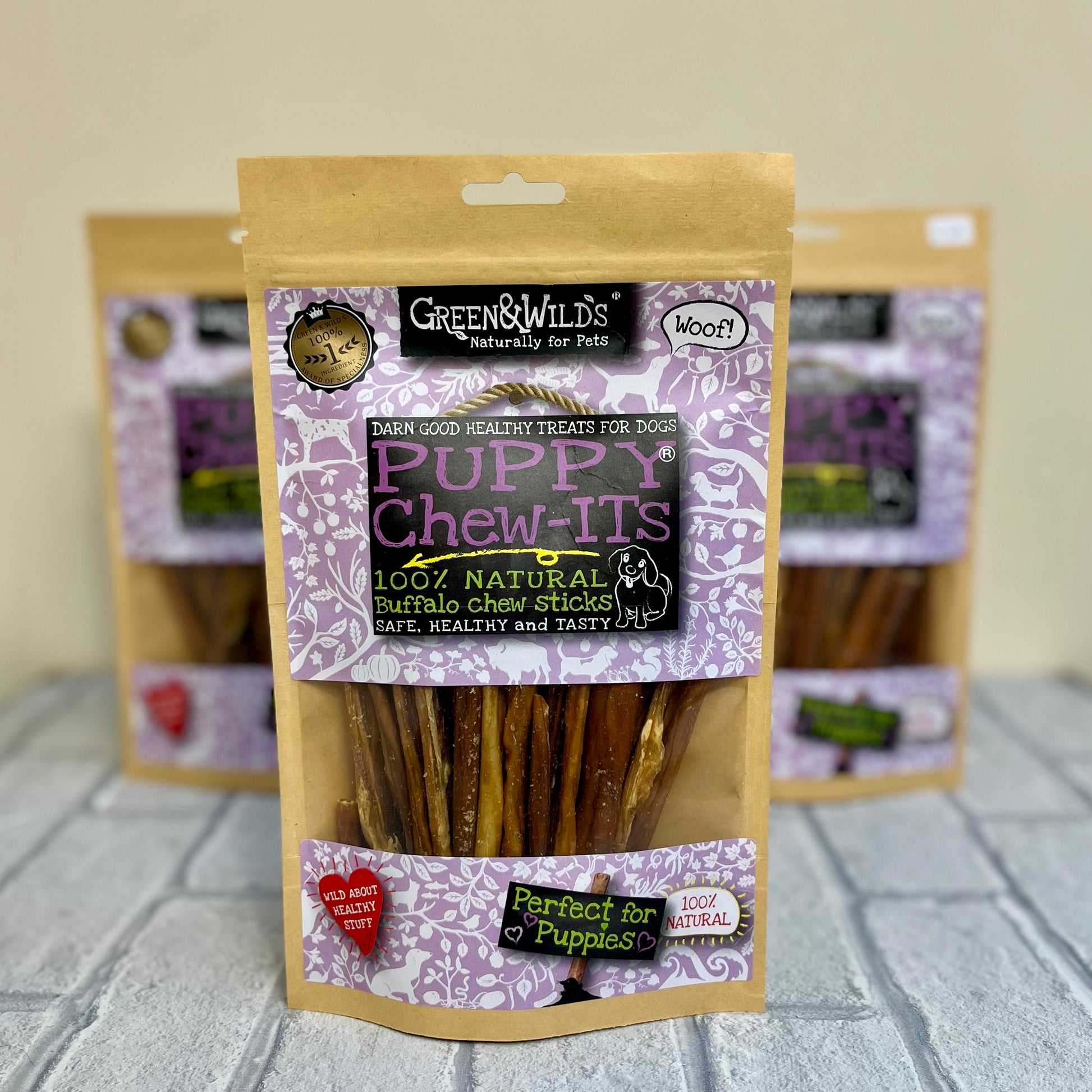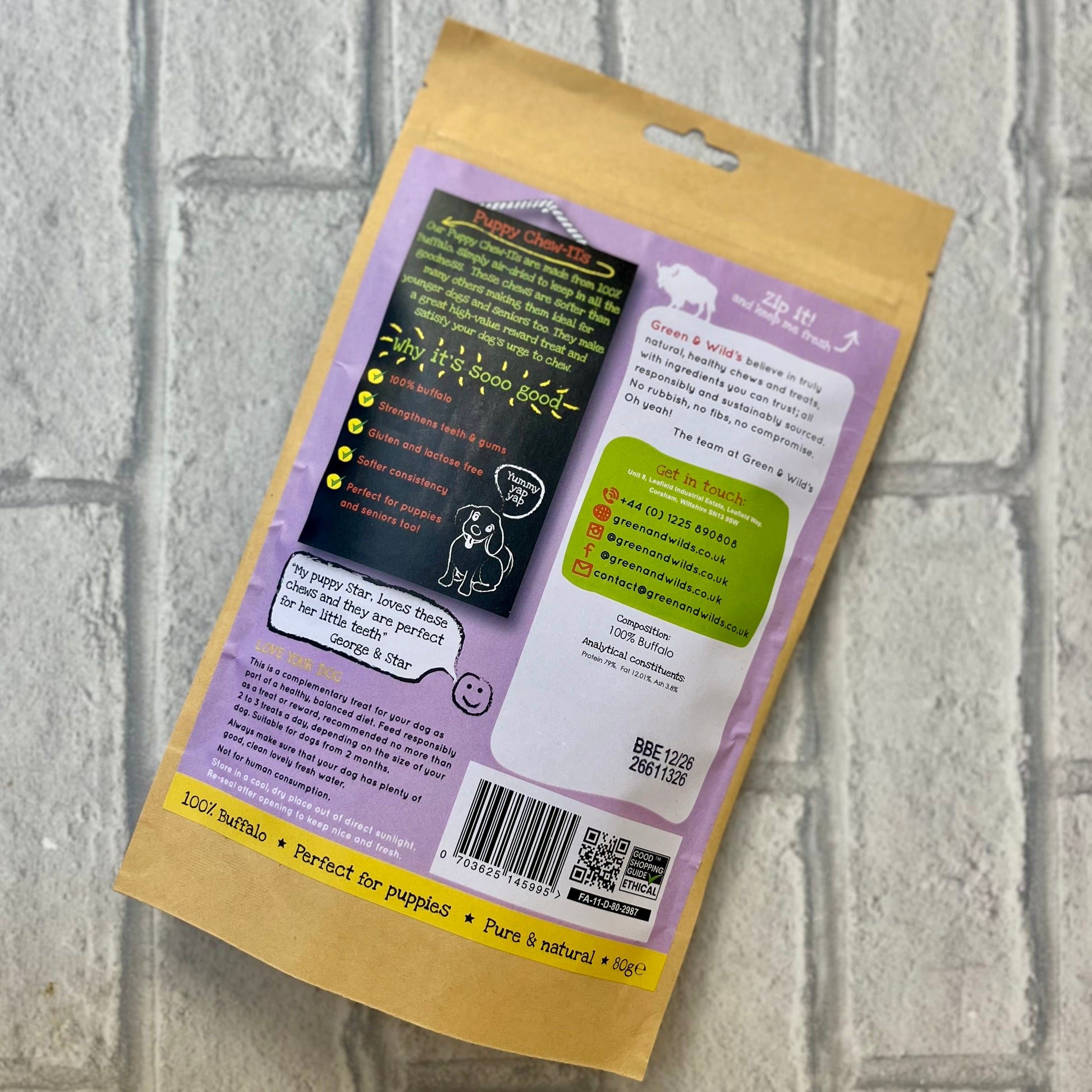 Puppy Chew-Its are a 100% natural Buffalo chew. A great softer texture natural snack or treat, suitable for puppies from 8 weeks. As they're a softer consistency they're great for seniors too.