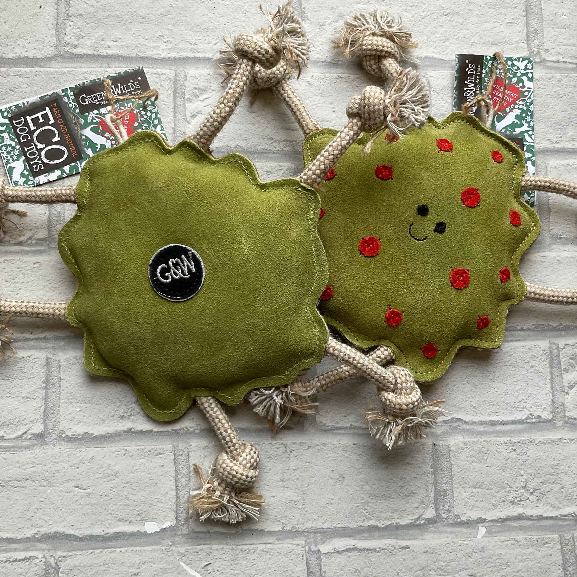 Made from a suede outer with natural jute fibre stuffing and jute rope legs. Jute is a natural, sustainable plant fibre. The suede is a by-product and ensures that this material is not wasted. Tough and long-lasting, made without using any compound that would harm or be released when chewed. Jute is 100% biodegradable.